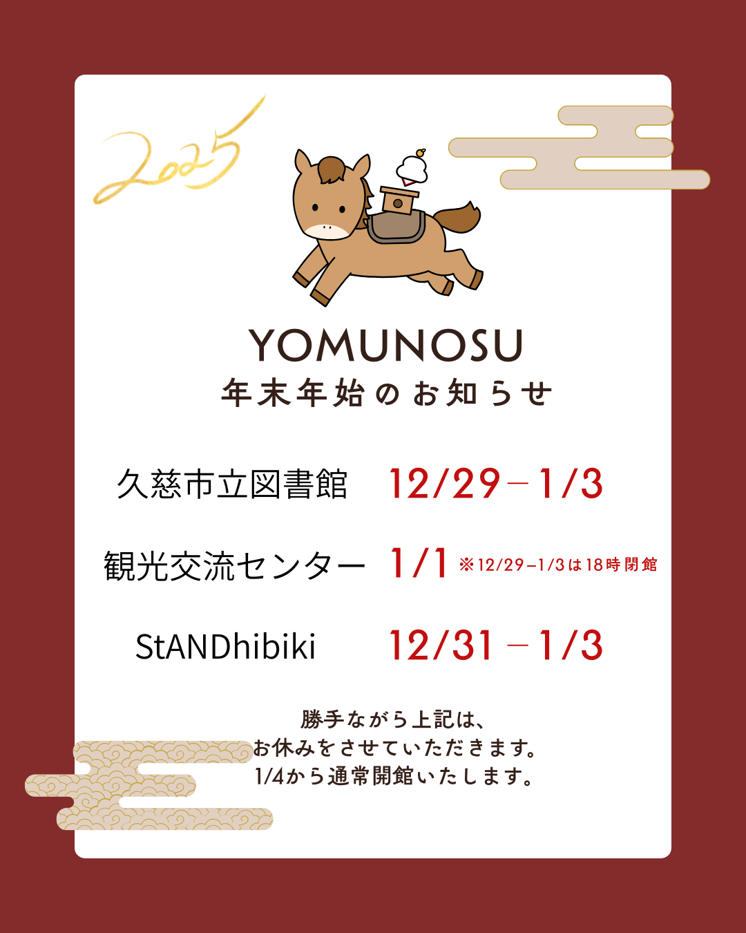 2026年1月4日より通常開館・営業とさせていただきます。
